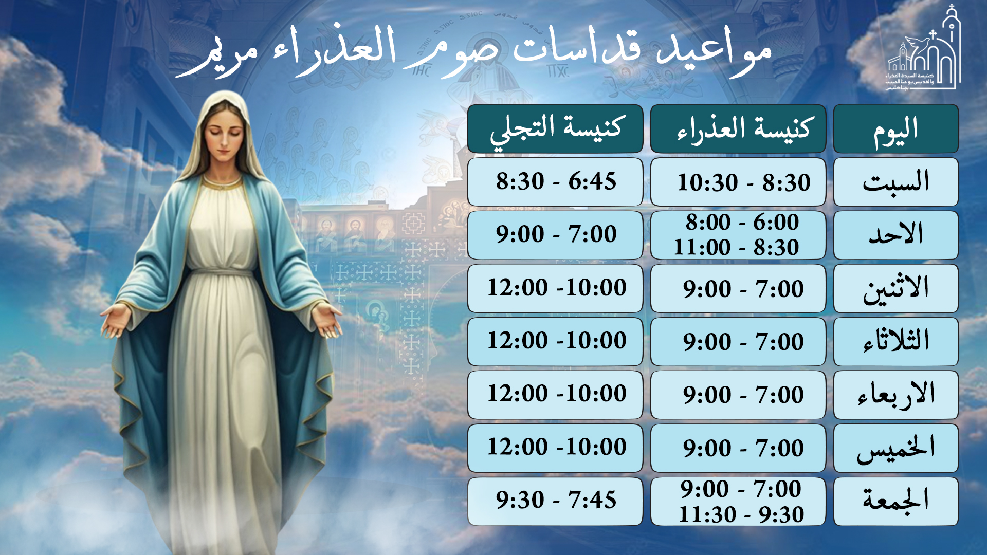 مواعيد قداسات صوم العذراء مريم 2025